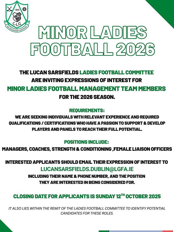 The Lucan Sarsfields Ladies Football Committee are inviting expressions of interest for Minor Ladies Football Management Team members for the 2026 Season.